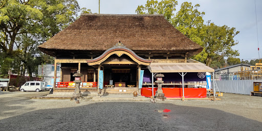 青井阿蘇神社(あおいあそじんじゃ)は、熊本県人吉市上青井町に鎮座し旧社格は県社で、現在は神社本庁の別表神社。地元では親しみを込めて「青井さん」と称されている。 創建は大同元年(806年)と伝えられる。阿蘇神社に祀られる十二神のうち、初代の天皇である神武天皇の孫にあたられる健磐龍命(たけいわたつのみこと)、その妃の阿蘇津媛命(あそつひめのみこと)、お二人の子供の國造速甕玉命(くにのみやつこはやみかたまのみこと)の三柱。阿蘇神社の御分霊をお祀りした神社は、全国に523社が鎮座し、内訳としては熊本県に461社、大分県に32社、福岡県に7社、宮崎県に5社、長崎県に4社と九州に509社が鎮座し、青森県を北限とし本州に14社が確認されている。大同元年(806年)9月9日に阿蘇神社の神主、尾方権助大神惟基が神託により阿蘇神社から阿蘇三社の分霊を当地祀ったのに始まると伝える。その後天喜年中(11世紀中半)に再興され、建久9年(1198年)に領主として藤原(相良)長頼が当地へ下向した際にも再営して自家の氏神として尊崇、神領216石を寄進する等相良家歴代の篤い崇敬を受け、延徳3年(1491年)の為続による社殿造営を始めとする数度の社殿の造営、修造が行われた。なお、阿蘇神社の分霊社ではあるが、同神社の大宮司家(阿蘇氏)が南北朝の内乱期や戦国時代に相良氏と対立することが多かったためか阿蘇神社との関係は薄く、当神社は独自の宗教的展開を図っていたものと考えられる。 明治5年(1872年)8月に郷社に列し、昭和10年(1935年)11月県社に昇格した。 現存の本殿、廊、幣殿、拝殿の中心的社殿と楼門の計5棟は、人吉藩初代藩主相良長毎とその重臣相良清兵衛の発起により、慶長15年(1610年)から同18年にかけて造営されたものである。 本殿は三間社流造銅板葺。側面と背面の桟を×型とする点や長押上の小壁に格狭間(ごうざま)を設ける点などに球磨地方の社寺建築の特徴が見られる。廊は本殿と幣殿を連絡する社殿で、梁間1間、桁行1間切妻造銅板葺。左右両柱の持ち送りに龍の彫刻を施すが、これは南九州の近世社寺建築に影響を与えたとされる。幣殿は梁間3間、桁行5間の寄棟造妻入茅葺で前面は拝殿に接続する。内部外部ともに華麗な装飾が見られるが、内部小壁の装飾彫刻の図様が柱間内で完結せずに柱を超えてつながる点や餝金具の技法に特徴があり、これは当時の最先端技法をいち早く取り入れたものという。以上3棟は慶長15年の竣工。拝殿は慶長16年の竣工で、桁行7間、梁間3間、寄棟造平入茅葺。前面に1間の唐破風造銅板葺の向拝(こうはい)を付ける。梁間3間のうち手前1間通りを吹き放しとし、その奥は拝殿、神楽殿、神供所(じんくしょ)の3つに仕切られ、当地方独特の舞台装飾が施された神楽殿では、10月8日の夕刻に球磨神楽が演じられる。 慶長18年に竣工した楼門は禅宗様に桃山様式を取り入れた寄棟造茅葺の三間一戸八脚門。組物は初層を二手先、上層を三手先とし、柱間は地覆と貫で固め、柱上には初層・上層ともに台輪を渡す。上層四隅の隅木下に陰陽一対の鬼面を嵌め込む点が珍しく、これは当地方独自の「人吉様式」と呼ばれる。 以上の5棟は、軒から下を黒漆塗としつつも組物や角材の面取り部分に赤漆を併用する技法や、急勾配な茅葺屋根、壁面の格狭間や木鼻(きばな)等に見られる細部の意匠に中世以来の人吉球磨地方独自の意匠を継承する一方で、鍍金を施した餝金具等の繊細、優美な植物文様といった桃山時代の華麗な装飾性も取り入れたものとなっている。昭和8年(1933年)1月23日に国宝保存法に基づき当時の国宝(いわゆる旧国宝)に指定され、同25年には文化財保護法施行に伴い重要文化財となった。同34年の解体修理で梁木から発見された棟札と銘札5枚は昭和55年に重要文化財の附(つけたり)として追加指定されている同時期に一連の建造物として統一的意匠を持って造営されたものである点や、地方的様式を継承しつつ桃山様式も採り容れて当地における社寺建築の手本となっている点、南九州地方における近世神社建築へ影響を与えた点が認められ平成20年(2008年)6月9日付で国宝に指定された。これは茅葺の社寺建造物としては初の国宝指定であり、また建造物はもとより熊本県に現存する文化財としても初めての国宝指定となった。球磨川の氾濫域にあり、しばしば浸水被害に見舞われてきた。昭和40年(1965年)の球磨川大水害では近隣の住宅地で2.1m、昭和46年(1971年)の水害で1.1mの浸水高を記録。さらに令和2年豪雨災害(2020年)には4.3mの浸水高を記録し国宝の拝殿が床上浸水、国登録文化財の禊橋は濁流で欄干が損壊するなどの被害が出た。 境内は以外と狭く、こじんまりとした印象。南国の神社らしく明るく穏やかな空気感が漂う。 目の前には球磨川の清冽な流れの川面がある。赤い欄干の太鼓橋のモニュメントが黒基調の建造物に映える。駐車場は小道を挟んで境内の横にあり、約30台程...