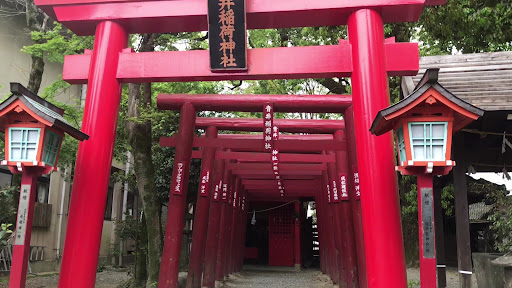 The shrine has a beautiful traditional structure, with a unique thatched roof (like woven hay — not something you see every day!) and a striking red torii gate at the entrance. It feels historic and sacred, even in the heat.