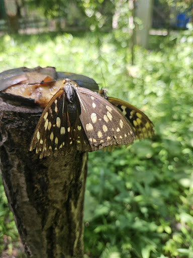 オオムラサキを放し飼いにしている室内には、多くのオオムラサキが餌場で蜜を吸っている様子を観察できます。 しかし、訪問時期が遅かったのか、たくさんの人に掴まれてしまったのかは分かりませんが、羽はボロボロ、鱗粉ははがれて美しい色はしっかり確認することはできませんでした。 ベストは7月上旬なのかもしれません。