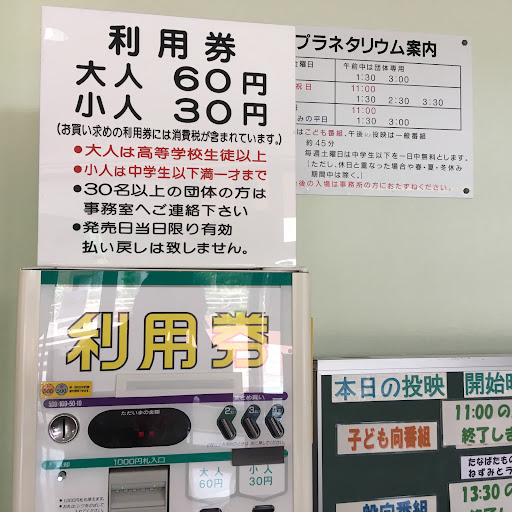 Read more昔は50円だったけど値上げして60円になったと聞いて、それでも利益があるか不思議なプラネタリウムです。 晴れた日はプラネタリウムの時間まではアスレチックなどで時間を潰せますが、雨の日は滑るからか遊べなくなっており、時間に合わせて来るのがベストかと思います。小さなお子さんであれば、隣の館に図書館がありますのでそちらで絵本でも読んで時間つぶしもありかも知れません。 駐車場は沢山あるのですが分散してますので付近の看板をよく見て見逃...