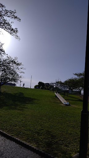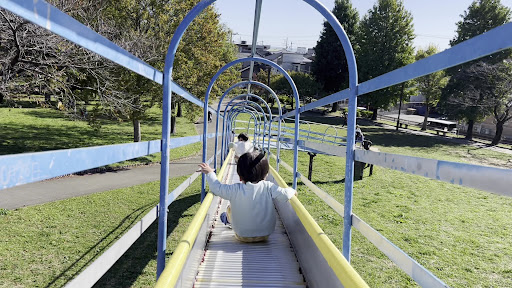 2023年10月時点です。 春先はお花見スポットとして、賑やかな公園ですが、1年を通して遊べます。 公園の象徴と言うべき、ローラーの滑り台や、砂場に通じる斜面にある、コンクリートの滑り台。 砂場、鉄棒、シーソー、ブランコがありますが、それらは幼児向けでしょうか。