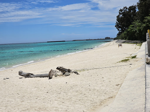 青少年村の管理棟で清掃管理料:大人100円/小人50円を払い(他の人の書き込みにもある通り管理人さんは、なぜか?客に塩対応、正直気分悪いですが、いつもそうみたいなので気にしない気にしない!)、そのまま車でビーチの売店裏・駐車スペースへ。 干潮タイミングでの訪問だったので潮位的に泳げるか?心配でしたが、なんとか泳げる水深でした! 遊泳スペースの海底のほとんどが砂地ですが、たまにある岩の底周りではチョコチョコ魚が見れました(クラゲ防止ネットに囲まれた遊泳区域内のシュノーケリングは禁止) 夏休みシーズン真っ只中なのに、自分達グループ以外もう1組だけで、とにかく超人が少なく、快適。砂浜、水質もよく綺麗。 パラソルのレンタルはないものの、売店には屋根による日陰あり、またビーチの端の山側は木陰もあり。