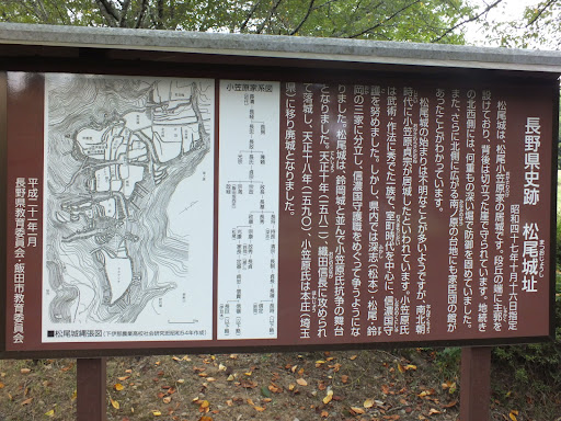 Read more鈴岡城跡公園と橋でつながっているため、とても行きやすい、城跡です、松尾城跡🏯ですが、こちらも、公園になっています、城跡の説明板と名前の書いてある立て札、名前の石碑があります、堀、井戸跡、曲輪、本丸跡など、が、ありますが、各場所に説明板がないため、本曲輪(主郭)と本丸跡くらいしか分かりませんでした、せめて、分かりやすいように、この場所には、『~がありました』くらいの、看板は、各場所に、欲しかったです、どこがどの場所かわかりにくかったです、がそれでもいい城跡でした、僕的には、鈴岡城跡の方が好きです、城主は、下伊那松尾小笠原氏、小笠原光康公で、となりの鈴岡小笠原氏、小笠原政秀公と争い、政秀公を倒して、下伊那は、松尾小笠原...