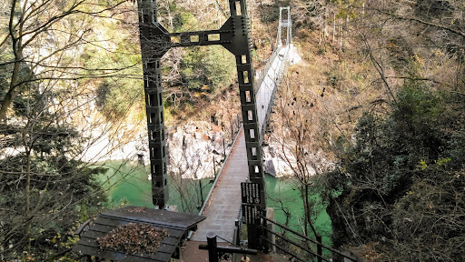 少し[遊歩道]を行くと、そうですね5分位に成りますが、先に<天竜峡🏞️>の峡谷が見えてきます。 更に行くと吊り橋🌉が掛かっています。 僕👔は階段を下りて行くのが大変😖💦だと諦めて引き返しましたが、其の先にまだ、[遊歩道]が続いているかは藪の中でしょ⁉️🤞。