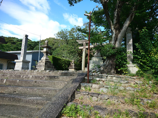くろんど池の帰りにブラブラと車を走らせてたら見慣れない場所にひっそりした鳥居を発見。くろんど池は小学校の遠足で何回も来てたしそれ以降も何十回も訪れてます。 前は京阪交野線の私市からハイキングみたいにくろんど池まで行ってたけど最近は車でスッと気分で来てて何回も同じ道を通るのたけれども初めて神社があるのを知りました。 車を降りて周りを見れば地元の昔ながらの薬局が鳥居の横で営まれてます。それもまた不思議。コンビニもないこの地域の地元の人はこういったお店を利用してるのですね。 とか思いながら鳥居の向こうへ。 鳥のさえずりを聞きながらどんどん道なりに進んでいくと急な階段が現れます。ひたすら上がって行くと神社が見えてきました。 周り360度竹林だったかな、森林に囲まれてます。それだけでも神秘的なのだけれども、舞の舞台みたいなのが道のセンターに設置されてたり道の両サイドには変わった竪穴式住居?みたいな屋根付きの小屋が5つありました。 何に使われるのかわからないけど先にお参りに100円入れて願い事をしました。