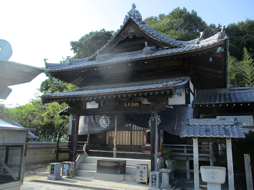 松山から山の中の道で来たので、58.57と来て56泰山寺をお参り。道沿いの広い駐車場に停めて納経所で200円納めます。