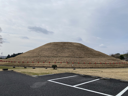 墳の回りには赤い壷型の埴輪の模造品が並んでいて、昔は古墳自体は白い石で覆われ、ベンガラで赤く彩飾された壷型の埴輪が回りにあったそうです。