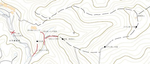 Read moreGoogleMapを見てたら、寂光院の石仏群から南へ下る道がありそうで。 国土地理院の地図を見てたら、寂光院南東の沢から尾根に登って南側から継鹿尾山頂へ行く道がありそうで。 行った道を戻るってぇのが嫌いなもので、周回コースイケるんじゃぁないかと思ったのが大きな間違いだった。 まず、石仏群から南へ下る道なんて、無かった。 寂光院の南東から沢へ下る道はあった。昔はちゃんと整備されてたかもだけど人が通らなくなって久しいような道。所々倒木が道を塞いでたり。下るにつれて道が怪しくなり。自然が人を拒絶してる感がどんどんと・・・ 問題は、沢から尾根へ上がる道。行って見たら、そんな道は全然ない。人が通った痕跡すらない。気楽に登れそうな斜度でもない。 つまり、寂光院から南東へ下る道は、行き止まりです。 継鹿尾山頂から大平山第一号墳第二号墳を通って尾根の岩場までは、怪しいながらも道...