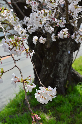 下車後,映入眼簾的是綻放滿堤的櫻花,此地櫻花已開八分。