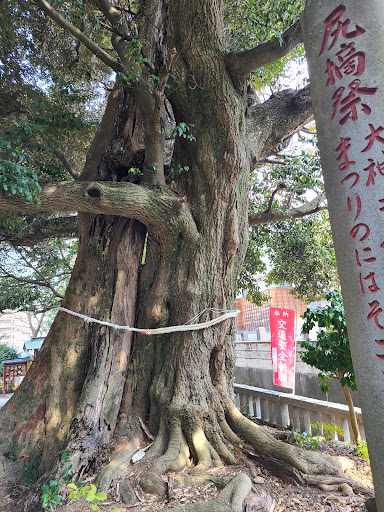 神社には天然記念物の大樹である、タブの木とシイの木が御神木として有ります。 タブの木は樹齢1000年とされます。またタブの木は二本並んで立っており、一本がもう一本を後ろから抱き抱える様に立っています。その姿は頼朝が八重姫を抱いている仲睦まじい姿の様だとされています。(写真10枚目)