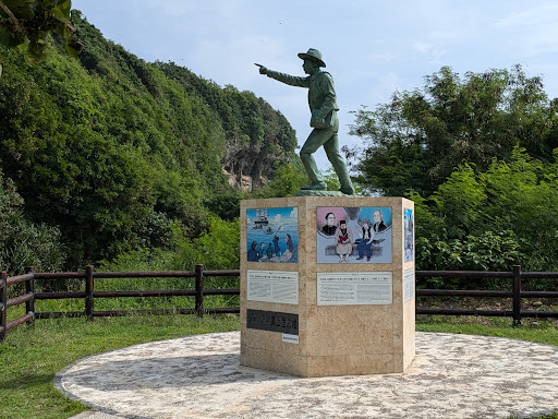 米須地域を歩いていた時に「ジョン万次郎上陸の地」と言う真新しい看板を見かけ、興味がありましたので、立ち寄る事になりました。私はその日の朝早く糸満市を後にして、「ひめゆりの塔」等の慰霊碑を訪れたいと思い、ひたすら国道を歩いてました。太平洋戦争終戦間近の沖縄は、アメリカ兵相手に母国や同士、そして幼い子ども達を守ろうと、防空壕内で無念の死を遂げた事を、漫画「はだしのゲン」で知り、大人になっていつか訪れたいと言った目標を達成出来た事で感動に浸ってました。そこから更に進んでいると、「ジョン万次郎上陸の地」の真新しい看板を見つけました。そこには、ジョン万次郎の銅像が建てられてました。銅像の足元には4コマでジョン万次郎が当時何をしてきたのかが、まとめて書かれてました。すると後ろにいた男性から声をかけられました。「あなた、どこから来られたのですか?」すかさず私は「福岡から観光で来ました。」と答えました。男性は「実は今日先ほどまで、銅像の周辺を勇士たちと草取りをして、休んでいた所なんです。」勇士たちとは?と思っていると「ちょうど戻ってきたようだ」と海岸の方に指差すと3人の男性達が歩いて銅像の所に集まってきました。その中の1人、ジョン万次郎氏の伝記の著者でもあり、銅像を建てる先駆者の和田先生当人に会う事が出来ました。ジョン万次郎氏の活躍された更に詳しい内容や、5年後にNHK大河ドラマにジョン万次郎を出す計画を進めているなど、その日は充実した日を送る事が出来ました。和田先生はお住いが近いと言う事もあって、頻繁に「ジョン万次郎上陸の地」の銅像周辺にいらっしゃると言う事ですので、運の良い方はお会...