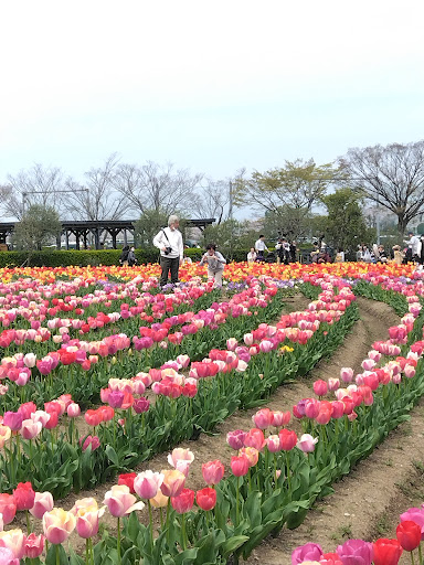 チューリップの季節になりました。 昨年のシーズンも素晴らしい眺めでしたので、期待して来ました。 色や植え付けのバージョンは、変えていて、やはり美しい風景です。 薄曇りから時々晴れ間がある今日の天気も素晴らしく、写真撮影日和です。 お弁当を買ってきて、芝桜の丘のベンチで頂きながら、ゆったりと過ごしましたよ。 日本庭園の桜のピンク、ベニカナメの赤、椿の朱色、レンギョウや垂れ下がるオウバイの黄色など、カラフルで素晴らしい眺めです。 シートを敷いてお花見弁当を広げている家族、グ...