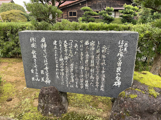 Read more加賀市〔全昌寺〕の庭には多くの碑が建っている。 ・おくの細道碑 大聖寺の城外全昌寺と云寺に泊る・・ 〔奥の細道〕の内、全昌寺に関わる一節。裏面の説明では、芭蕉の自筆という。 ・芭蕉句碑 庭掃て出てはや寺に散柳 はせを 〔はせを塚〕とは別の碑。 ・二宮木圭句碑 爪杖は如意のことなり柳蔭 〔はせを塚〕は木圭らによって建立された碑。 ・流水句碑 音たへぬ古池にそう柳かな 詳細は分からないが、金沢の俳人・綱村流水か? ・杉山杉風作 芭蕉坐像 ・深田久弥句碑 翁忌や師をつぐ故に師を模さず 九山 ・全昌寺、芭蕉忌における深田久弥(九山)作・全句 深田久弥:「日本百名山」などで知られる作家、俳人、登山家。俳人としては高浜虚子に師事。...