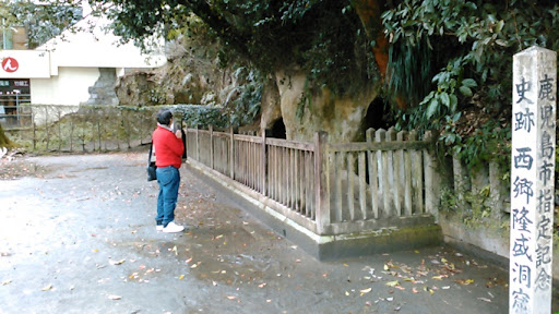 西南戦争の明治10年(1877)9月19日から同24日未明に至る6日間を西郷南洲はここの洞窟で起居しました。薩軍と政府軍との城山攻防戦という西南戦争の最終段階であり、政府軍の城山包囲網の中、西郷隆盛はこの洞窟で過ごし、最後まで薩軍の指揮をとっていた場所として、重要な史跡です。現在の洞窟の規模は、奥行きが4m、間口が3m、入口の高さは2.5mです。昭和49年(1974)、鹿児島市の記念物(史跡)に指定されました。駐車場はありません。洞窟の側にお土産店があり、地下1階が薩摩切子や屋久杉などの高価なお土産とともにふつーのお菓子のお土産も雑多に売ってます。店番のおばちゃんが薩摩切子の高いやつを触らせてくれます。どっちがすごいのかなぞなぞを仕掛けてきますので、まるっこいほうがおばちゃんにとってはすごいらしいので、とりあえずまるっこいほうが凄いと言っておきましょう。しかし、説明を聞くと、軽い方が薄いので加工が難しいはずなんだけどなーとも思えるので、安請け合いしない方がいいかも知れません。そんなもん好みです✨。1階は革製品を中心にアーリーアメリカン的な小物が売られています。雑貨やさんですな。二階はその革製品をつくる加工場らしく、二階に上がろうとすると「皮しか売りよらんばい」と言われます。革製品をもっとたくさん見たかったです。素敵な財布が売ってたのでいくらか尋ねると12000円とふっかけられました。なので、値切ったら、消費税だけ安くしてくれました。10000円にまけてくださいといえばよかったかもしれません。しくじりました。でも、ハンドメイドの素敵な財布だったので、まけてもらえなかった2000円分は製作された革細工職人さんに渡してほしいです。けっして、店番のおばちゃんの時給に...