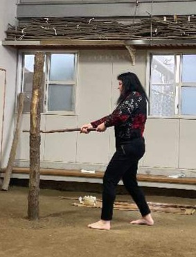 あの有名な示現流独特の木刀も握らせていただいた。 示現流の木刀は我々が思い浮かべる木刀とは異なる。 普通の木刀は木の棒を刀に似せて削り込んだものだが、示現流の木刀は木の枝を切り取って乾燥させただけの、木の棒そのものなのである。