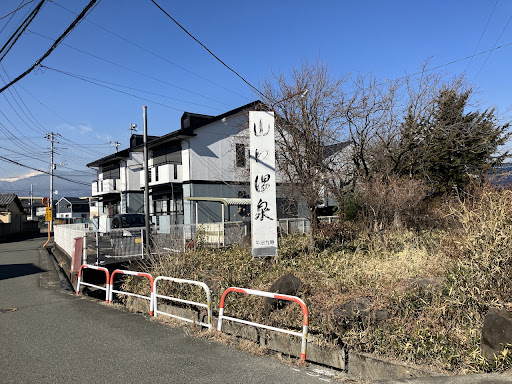 甲府駅前1番バス停から、約20分弱ぐらいで最寄りの榎局バス停に到着。そこから住宅街を10分歩き、住宅街のど真ん中に温泉はありました。看板があるのですが、住宅街に溶け込んでいるので、最初どこに施設があるのかわかりませんでした。民家かなぁと恐る恐る近付き、山口温泉の看板を見つけ、やっと一安心。