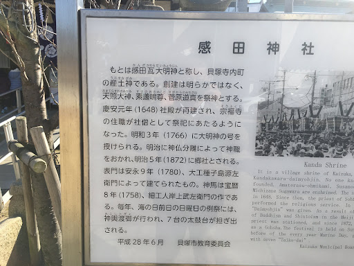 Read more創建は不明だが、もとは村の発展を願い、天照大御神、素盞烏尊、菅原道真をお迎えして氏神としお祀りしたのが始まりとされている貝塚寺内町の産土神。 社地は神田河原と呼ばれ、慶安元年(1648年)社殿が再建された折に河原を瓦と替えて感田瓦大明神と称された。社殿再建から220年間、宗福寺の住職が社僧として祭祀にあたっていたが明治に神仏分離によって神職を置かれ、明治5年(1872年)に郷社とされる。 表門は安永9年(1780年)、大工種子島源左衛門によって建てられたもの。神馬は宝暦8年(1758年)、細工人岸上武左衛門の作である。毎年、海の日前日の日曜日例祭には、神輿渡御が行われ、七代の太鼓...
