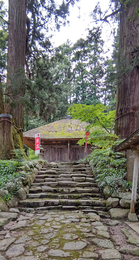 奥州藤原氏三代秀衡公の奥方様により、この御堂が建立されたそうな。 本県最古の木造建築でな、国の重要文化財に指定されておるのじゃ。 御堂に保存されとる「高蔵寺」の額はのぉ、 かの嵯峨天皇の御宸筆であらせられるのじゃ。