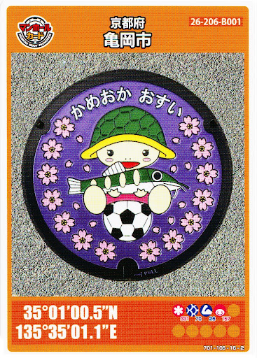 Read more🌟🕳️⭐️【マンホール蓋『亀岡市B』 】⭐️🕳️🌟 【カード】京都府亀岡市マンホールカードB 【番 号】第13弾(26-206-B001) 【発 行】2020年12月17日 (平成32年) 【取得日】2025年06月03日(令和07年) 【蓋座標】京都府亀岡市亀岡駅北一丁目 「京都サンガスタジアム」前歩道上 (北緯) 30度01分00.50秒 (東経)135度35分 01.10秒 【順 路】JR嵯峨野線「亀岡駅」から徒歩約1分 【駐車場】JR亀岡駅前駐車場利用可能 【設置年】2020年(平成32年) 【図 柄】亀岡市Bのマンホールデザインは、観光マス コット「アユモドキーパーくん」を中央に描き その周りに市の木である「桜」の花を散りばめ たマンホール蓋です。 【平日配布】:京都府亀岡市古世町中内坪1 亀岡市文化資料館「1階受付」 電話番号:0771-22-0599 配布時間:09:30~17:30 休 館 ...