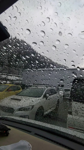 2023/2/8 朝から雨が降ってます(駐車場) たまに晴れ間が出ますが、ほぼ雨です ゲレンデはみぞれっぽいですがすぐにとけるので実質雨みたいなもんです。 バーンは予想通りのしっとりした感じで滑りやすいです。ビチョビチョにはなりますけど、