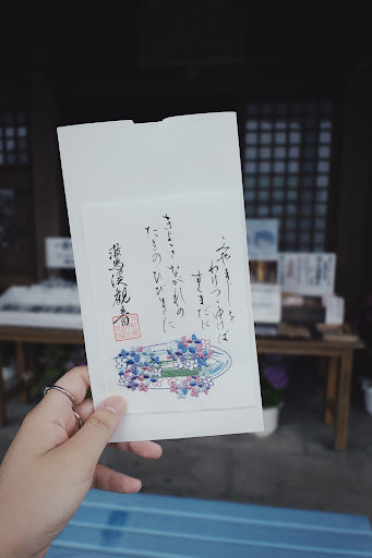 Lovely temple with a hydrangea garden. During the hydrangea season they had two special Shuin / sealed stamp for sale. I got the one with hydrangea embroidery. Think the path in the woods leading to the garden would look great in the fall as well with all the maple leaves. Highly recommend if you are traveling...