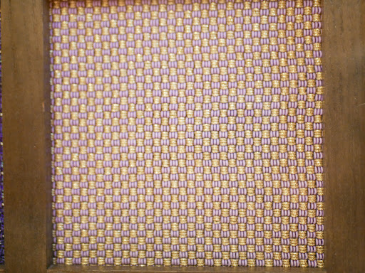 和室エリアにも水引で作られたものがたくさん。テーブルの中にも、正方形のキャンバスにパターンで模様を織り込んでいるのもおもしろく、実際に使った方がいたという、水引で編まれたウェディングドレスのリボンも素敵でした。