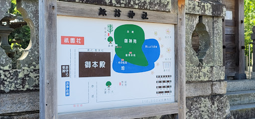 御祭神 建御名方命 天照大神 諏訪前命 延歴三年甲子十月二十七日御鎮座。宣化天皇の御代大伴狭手彦、新羅征伐戦勝祈願のため勧請せり。 特別由緒 昔本朝鷹狩りを知らず。韓人斎来此の地に鷹を持ち来りて朝廷に献らんと請う。勅使諏訪の前、此の松浦の社頭にて鷹を受け取り諏訪大神の愛を給う所となる。 或る時神鷹三本松と言える畠の中にて蝮の害にあう。大神怒り給い此の地より蝮を拂い除け給う。 諏訪の前は責任を感じ自害し、郷人その徳を慕い合祀す。斎来も此の地に客死す。末社に祭れり。田畠に胡麻、小豆、麻を作れり。故に此の地に此の三つを作らず。 古来より社前に詣り神砂を乞いて蝮除の護符とす。