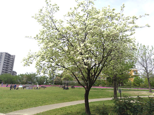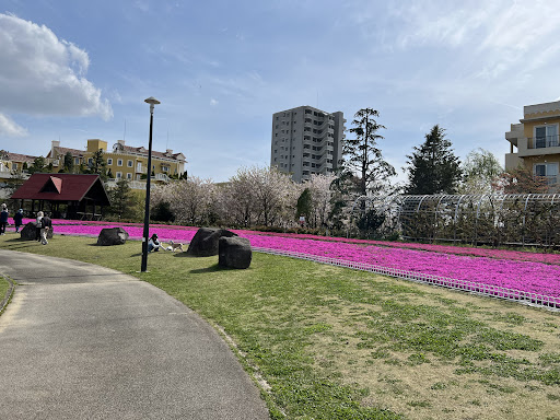 花壇は4月は芝桜が美しかった。 平日は、小さい子を連れたお母さん達、Instagramで見かけるような映え写真を撮るわんこ連れ、介護施設の団体客が多い。美しい公園なので、至る所で写真を撮る姿が見られた。 お花の手入れをされる方々が、手際良く手入れしながら楽しそうにお話されており、のどかで平和な雰囲気が印象的。