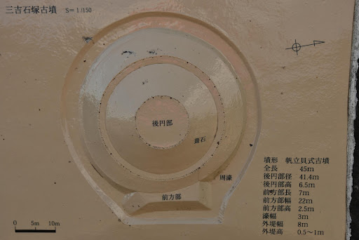 Read more出土した円筒埴輪から、5世紀後半に、築造されたとみられる、墳丘長45メートル、馬蹄形の周濠と外堤を備えた二段築成の帆立貝式前方後円墳です。ナガレ山古墳の散策後に伺ったので、またこのタイプかぁと…でも免疫ついてましたので。墳丘はかさ上げ復元と整備を施しているので、本来の姿と相違がないのかは、よくわからないですが、あまり例のない、前方部の張出し部と葺石も再現されており、墳丘周りの散策が可能です。案内板もあります。短時間なら古墳北側の墓地駐車...