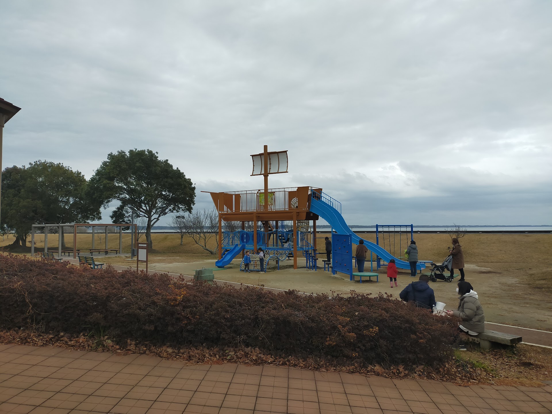 歩崎公園複合デッキ 歩崎公園(水族館脇)に霞ヶ浦に浮かぶ帆引き船がある風景、湖面風景の鑑賞や自然観察するための複合デッキ。 展望台と遊具の複合デッキとなっているため子ども達の遊び場としてはもちろん、新たに休憩所も整備されたため、遊んでいる子どもたちにも目が行き届く場所で休憩いただけます。