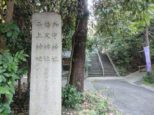資料によると、 加守の集落をのぼりつめた丘陵上に東面して鎮座する。神域は二上の西山麓にある。