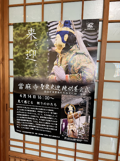 毎年4月14日に練供養会という一大イベントが行われます なんと千年以上も続くもので全国各地の練供養会の元祖だそうです それで2024年、国の重要無形民俗文化財に指定されました この練供養会は、その中将姫が二十五菩薩によって極楽浄土へ導かれる様を演劇風に再現したものです