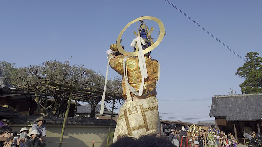 本堂から100メートルほどもある来迎橋と呼ばれるランウエイが仮設置され、読経と雅楽の流れる中、そこを僧侶様に導かれて沢山の菩薩様が練歩かれて、まるで天竺から二十五の菩薩様が本当にお迎えに来られたような宗教絵巻が繰り広げられるのです 観音菩薩様は両手で蓮台を左右にすくい上げる所作を繰り返されながら進まれます 来迎橋の周囲を埋める群衆はまるで極楽浄土への救いを求めて群がる人々のようです それを天上から菩薩様が救い上げようとなされながらお進みになるご様子を再現されているのです