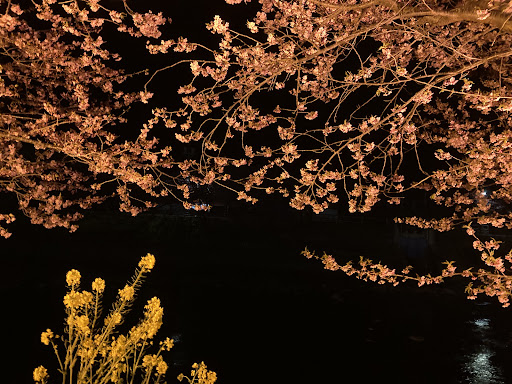 3月2日の夜19:00過ぎに到着しました。 河津桜祭りは終わっているものの、ライトアップはまだやっていました! 河川沿いにライトアップされており、人通りも少なく、ゆっくり周遊することができます。