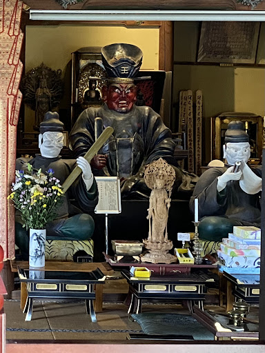 本堂は鍵が掛かっていたのでガラス越しに閻魔様を詣りました。 閻魔様の幞頭に「王」の文字。今まで見てきた閻魔様の中で一番顔の筋肉が隆起して怒りが顔にしっかり表れている閻魔様に見える。こちらの閻魔様の前には、死者の行いを徹底的に明らかにする「司命」と罪を記録するための巻物と筆を持った「司録」の2人がいらっしゃるのが興味深い。