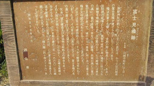 Read more高台の櫓跡に上がりました。 周りは樹木等で視野が遮られていますが築城当初は周囲の状況は一目瞭然でしたでしょう。 下の平地から高校野球部部活の喚声と金属バット音が聞こえてきます。 (富士見櫓)は本丸の西南に位置し大手門側(城の正面)から攻め込んでくる敵方と対峙しました。 上リ口に設置の案内板を要約すると天守を築城当初から持たない川越城は天守の代わりに3箇所の櫓を物見と防戦の足場として築き、その内の一番高い櫓が(富士見櫓)でした。 慶応2年(1866年)の記録には富士見櫓は長さ15メートル、幅14メートルと残っています。 暫く佇んでいると3才位の女の子とお父さんが下から石段に設置の手摺に掴まりながらゆっくりと上がってこられました。(すごいねぇ~頑張ってよくここまで来たねぇ)と声をすると女の子はにこり😊として(うん!)とペコリ頷きました。 お父さんも手を引きながら笑顔を返してくれました。 (富士見櫓跡)は市民の憩いの散歩コー...