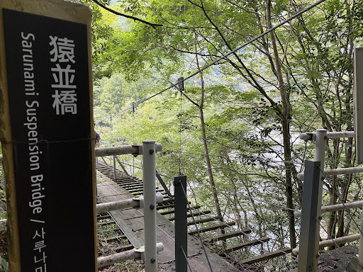 Read more寸又峡と言うと、どうしても「夢の吊橋」になってしまうのは仕方がありませんが、せっかくなので是非「猿並橋(さんなみばし)」にも足を向けてほしいですね。。。何といっても、誰も居ないので吊橋を独り占めできます! 夢の吊橋の行くゲートの手前に、右側に下っていく道(朝日岳登山口に繋がるグリーンシャワーロード)を進んでいきます。 途中で道案内がありますが、「猿並橋」の標識が左右二つあり、「えっ、どっち?!」と悩ませます。 左側は急勾配の登山道ですが最短ルート。右側は階段、遊歩道や休憩スペースも整備されている迂回ルートになっていて、どちらも吊橋には辿り着きますのでご安心を。 肝心な吊橋ですが、「夢の吊橋」は同時に10人まで、この「猿並橋」は5人までとなっており、気持ち揺れる気がします。 そして、この吊橋と木々、川、陽射し、風、自然を独り占めしてください! そして、余力があれば対岸から河原に降り(解りにくいのですが、橋を渡ったら直ぐ右側に河原に降りれる道があります)て、さらに自然を独占ください。 ★大切なお知らせ★ この川の上流1kmには「大間ダム」があります。 放流する場合がありますので、警報サイレンが鳴ったら、速やかに河原から上がって離れてください。 また、普段は水量は少ないですが、特に雨季などは細心の注意で、極力単独行動(独占には反しま...