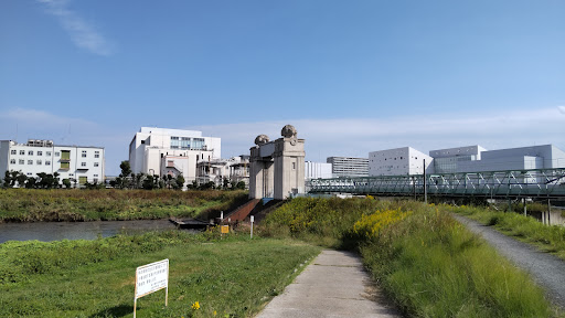 多摩川は、古くから水運に利用されてきました。 川崎においても、第一次世界大戦のによる好景気の中で、足りなくなった工場用地の拡大を図るため、運河・港湾計画が立てられました。 川崎河港水門は、この計画の一環として将来の発展に備えるべく、当時、多摩川改修事務所長であった内務技師金森誠之の設計により、大正15(1926)年11月に着工され、1年半後の昭和3(1928)年3月に完成しました。 この河港水門は、2本のタワーと、タワーをつなぐ梁、そしてゲートによって構成されています。タワー頭頂部には、籠に溢れんばかりに盛られた、当時の川崎の名産品であった梨・葡萄・桃をあしらった巨大な飾りが施され、現在は残っていませんが、タワーをつなぐ梁の側面には、レリーフ状のエジプト形式の舟が描かれており、当時の金額で54万円を掛けて造られました。 その後、運河・港湾計画は、現在の川崎区を対角線に横切る大運河計画となって昭和10(1935)年11月に運河幅員33~40mの都市計画事業として内務省の認可を得ましたが、道路のような建築制限がないため、計画予定地内に工場や社宅が建てられ、また、戦時体制へ突入など、社会情勢の変化から昭和18(1943)年3月に廃止され、幻の大運河計画となりました。 尚、この川崎河港水門は、平成10年(1998)度に、国の登録文化財(建...