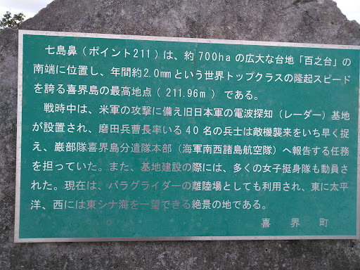 Read more七島鼻(ポイント211)は、約700haの広大な台地「百之台」の南端に位置し、いまだに年間約2.0mmという世界トップクラスの隆起スピードを誇る喜界島の最高地点(211.96m)です。 戦時中は米国の攻撃に備え旧日本軍のレーダー基地が設置され、敵機襲来をいち早く捉え海軍南西諸島航空隊へ報告する任務を担っていました。 現在はパラグライダーの離陸場としても利用され、東には太平洋、西には東シナ海を...