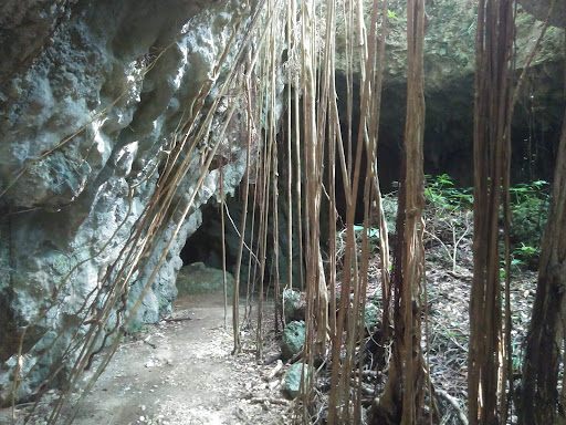 ウフヤグチ鍾乳洞 長さ30メートル位の短い鍾乳洞だが、入口は大きく中はドーム状の大きな空間があり神秘的。 ウフヤグチ鍾乳洞は別名「太谷口鍾乳洞」とも呼ばれていて、鍾乳石や石筍が発達して素晴らしいものだったらしいですが、戦争中に守備隊の防空陣地とされた際に、その鍾乳石は破壊され、石筍も取り除かれてしまった 現在は遊歩道が整備され太陽光を使って 中には電灯が付いています 島では探せば多くの鍾乳洞があると想像されます、以前滝川にある鍾乳洞の入り口に猫が迷い込み翌日嘉鈍ので見つかったと言う話は有名です
