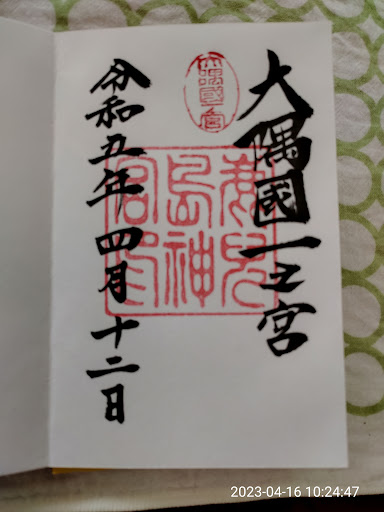 Read more2023年4月9日(日)と2023年4月12日(水)に参拝し御朱印をいただいた。 初回は夕方のため社務所が終了していた。後日、御朱印をいただきに再度訪れた。 「鹿児島神宮」の御朱印は右側に「大隅国一之宮」(直書き、初穂料300円)と書かれ、「鹿児島神宮」と「大隅国一之宮」の二つの朱印が押されている。 鹿児島神宮の御祭神は「海幸彦、山幸彦」。 無料の広い駐車場が有り、神殿まで比較的近いので高齢者で何とか行けると思う。トイレまでの距離は結構あり、あまり綺麗じゃなかった。 後方には高千穂峰が聳えている。神宮と山などの位置関係が大事だと言う。 2022年(令和4年)2月9日に国宝に指定さた。この日は霧島神宮と同じ指定日です。 2023年4月9日は、自然農法農場EMふれあい館、さくらさくら温泉、霧島神宮、霧島ふもとの駅、天降川(川の流れが急)に沿って「鹿児島神宮」に夕方参拝したが時間が遅く社務所は閉まっていた。 2023年4月12日カーナビに「鹿児島神社」と入力、鹿児島市内の神社に着き、名前間違いに気づき「鹿児島神宮」と修正し、たどり着き御朱印をもらえた。