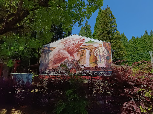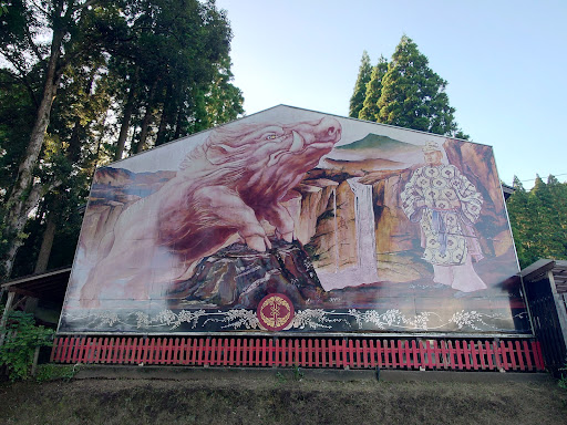 見事に咲いている時は花の香りも、房のこんもり具合いもそれはもう見事だと思います。 駐車場に着くとすぐに正面にある広場が白い藤棚があり、そこを抜けると神社の鳥居が見えます。そしてその隣に日本一大きな絵馬が立っております。今年っていのしし?って思える体でしたが、イヤイヤ御神体はがいのししとのこと。つい何年か前までは神社の境内に白いいのしし様がおられたそうです。観たかった。