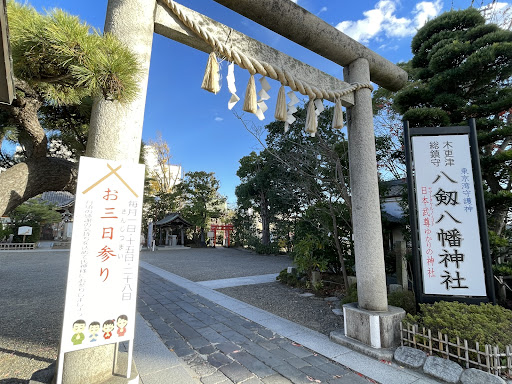 『古来八剱の里と呼ばれた当地木更津の総鎮守。日本武尊の東征で、浦賀から当地への渡航で海神の怒りを鎮めるために身を投げた妃橘姫を忍んで君去らずから木更津と呼ばれるようになった当地にに源頼朝が寄進した神領を起源とする由緒正しい神社。その後も木更津船の大坂冬の陣への貢献で家康から褒賞を受けるなど航海、商い、学業健康に霊験あらたかな神社である』