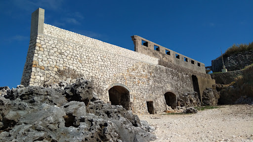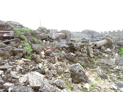 2022.11 島では観光のメインとなるもので、2017年2月に「北大東島燐鉱山遺跡」として国の史跡に登録されている。遺構というよりまさに遺跡だ。 穴の開いたトンネル状の建造物と奥に見える巨大な城壁のような建造物が目に残るが、操業時は建屋で屋根があり、燐鉱石の貯蔵倉庫だった。ここから海岸までトロッコで運ばれ、崖の上に設置された象の鼻とよばれる管のような装置で海上に浮かぶ艀に積み込まれた。艀は沖に停泊する輸送船との間を往復したが、出来高払いの歩合制だったようだ。 トンネルに開いた穴は、アメリカ統治時代、大量に採掘するために、コンベアーで流し込んだ穴のようだ。 他では見ることの...