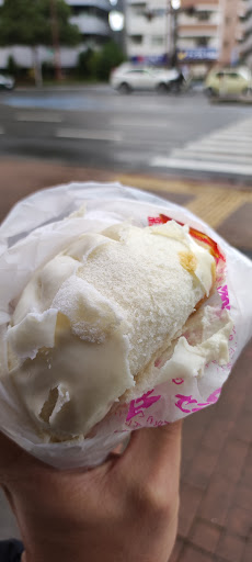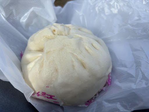 商店街のテイクアウト専門店で食べられるところを聞いたら「あっちの方にある本社工場」だとゆうので頑張って歩いてきました。 雨が降っていたけど温かいうちに食べたくて軒下を勝手に借りて食べてみたところこれは揚子江の豚まんでした。