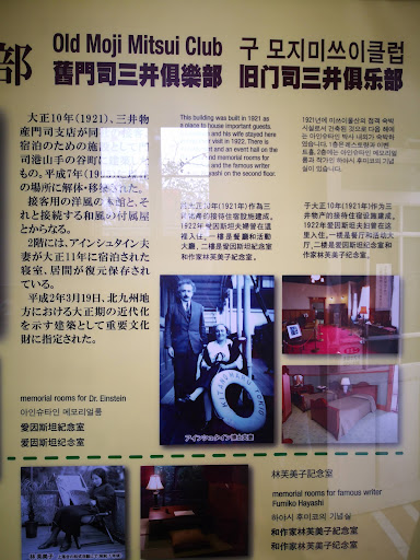 Read moreThe Old Moji Mitsui Club is located on the right side of Mojiko Station across the street. Mojiko is lined with old-fashioned Western-style buildings centered around the first pier, and one of the closest ones to the station is the Old Moji Mitsui Club. It is even more famous because it is said that Einstein and his wife stayed here. The first floor is a restaurant, and the second floor exhibits 200 items related to Hayashi Fumiko, a writer...