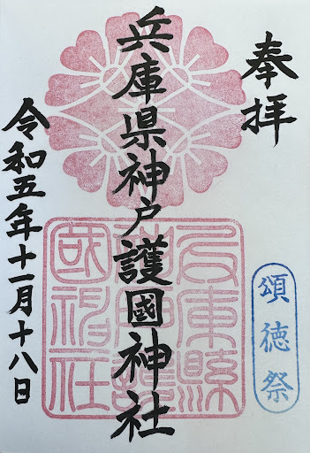 六甲の麓の住宅地に祀られておりました 。 鳥居の前で番兵をされている吽型の 狛犬さんには角がございました 。 お隣に小さな公園も併設されております 。 都市型の神社さんではありますが 敷地内には所々に木々植えれ緑が多く 六甲山を背にしている事も相まりまして とても住宅地とは思えない雰囲気でした 。 境内には末広稲荷社さん も鎮座されてます。 護国神社さんにしては珍しい様な気がする … 御朱印を1つ頂くことができました 。