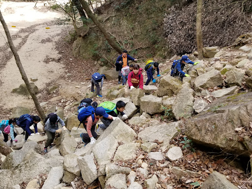 This is a really good place for a shortish hike. Once you have found the entrance (Ashiya Rock Garden) the start is pretty steep, gaining about 400m in a couple of kilometres, and you do actually need to scrabble up some small, steep sections, but it is really fun. I'd say its okay for kids aged 7 and upwards, though they'll need to be careful. My daughters really enjoy it.