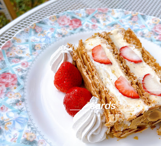 可愛らしい見た目の苺のミルフィーユは、想像よりもかなり大きくインパクトがあり、たっぷりの苺、濃厚なカスタードクリーム、サクサクなパイ生地で、とっても美味しかったです。
