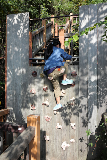 広いグラウンド、走り込みするような土の外周、小学生用の複合遊具、腹筋台やストレッチ用の健康器具、長い滑り台を目指すちょっとしたアスレチック、木を生やした散策エリアがあります。 複合遊具のそばには水分補給・手洗いできる水栓があります。 色んなところにベンチがあり、公園を広々と眺めるもよし、木に囲まれるもよし、眺望を楽しむもよし。平日も昼食だけ食べに来る人もちらほらと。 休日のグラウンドにはピクニックテントやサンシェードを立ててる人が多いですね。火気厳禁、灰皿はありません。 グラウンドはハゲハゲで凸凹だらけなので、サッカーボールが跳ねたり水たまりが多かったりと、本格的にスポーツするには快適な場所が少ないかもしれません。子供や犬と軽く遊ぶ程度なら全然いけます。